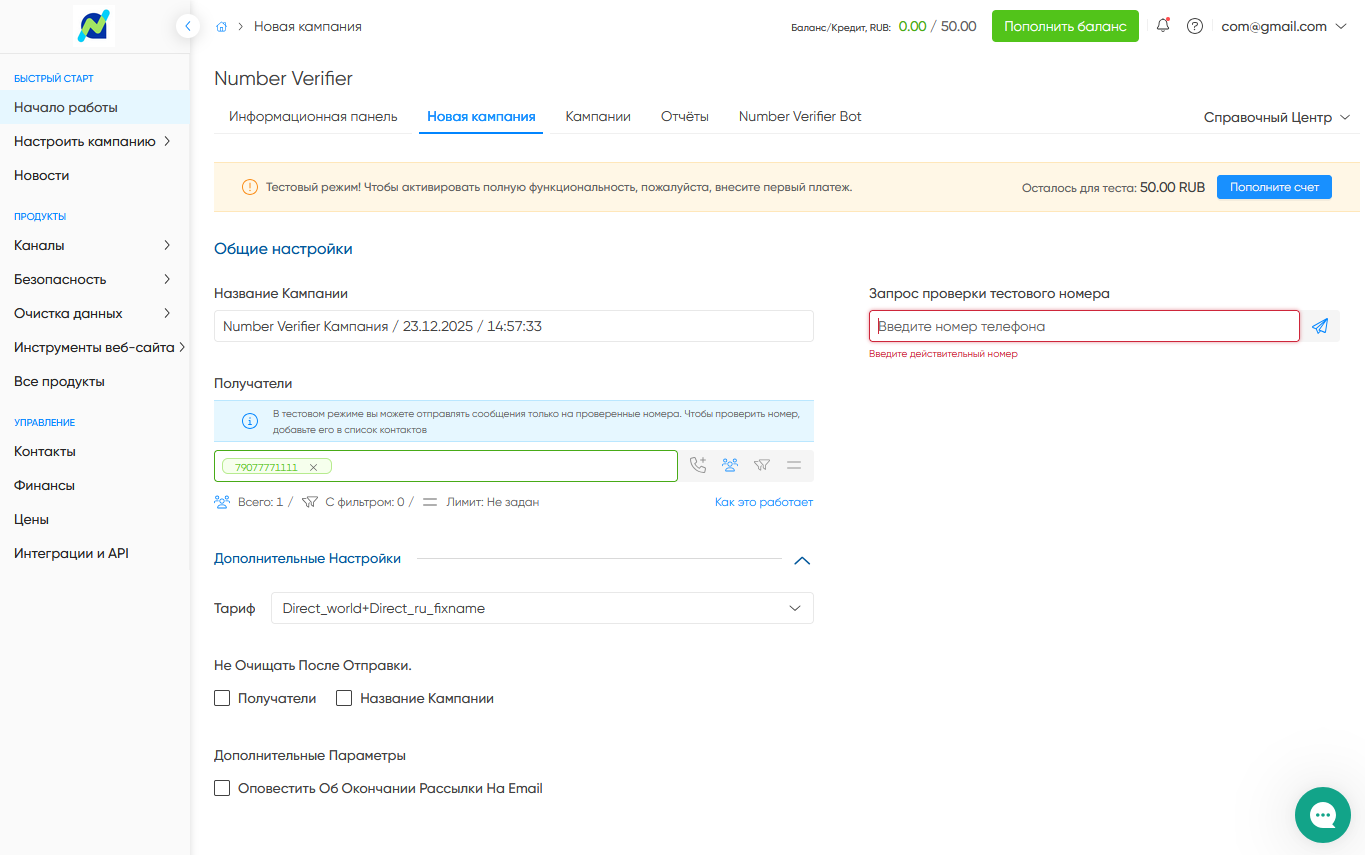 Процесс простой. Заходите в личный кабинет Notificore, переходите в раздел Number Verifier и создаёте новую кампанию.